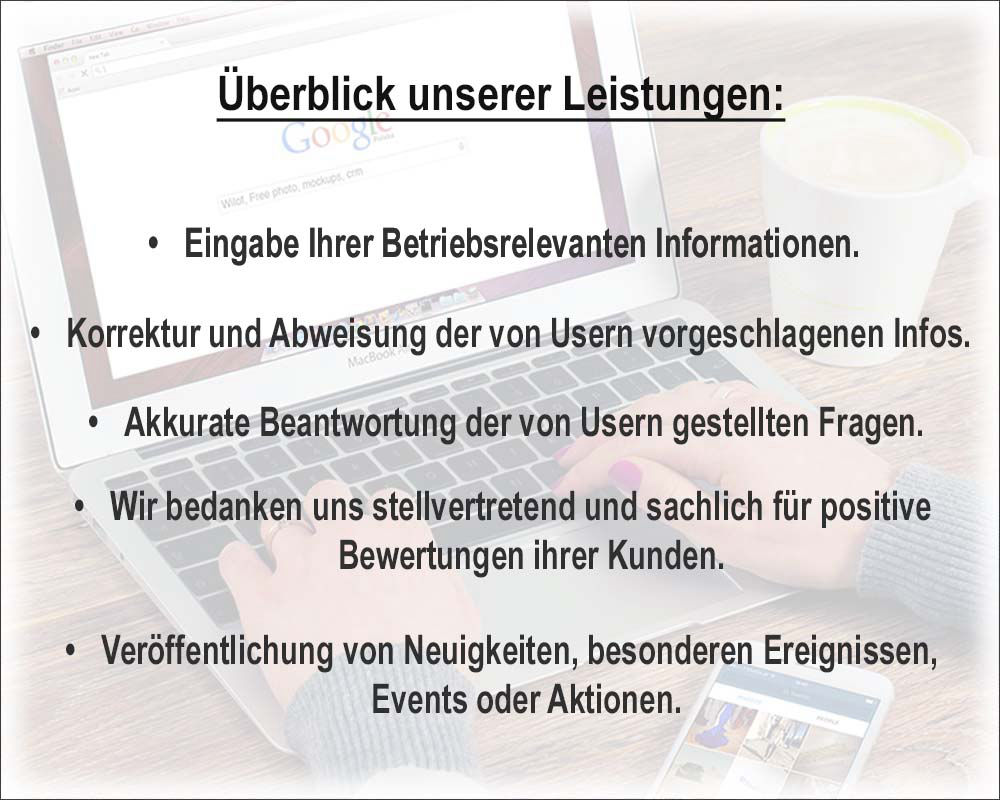 Wir Aktualisieren alle Daten in Ihrem Google My Business Profil. Damit ihre potenziellen Kunden und Google User, die richtigen Informationen zu ihrem Unternehmen, erhalten.